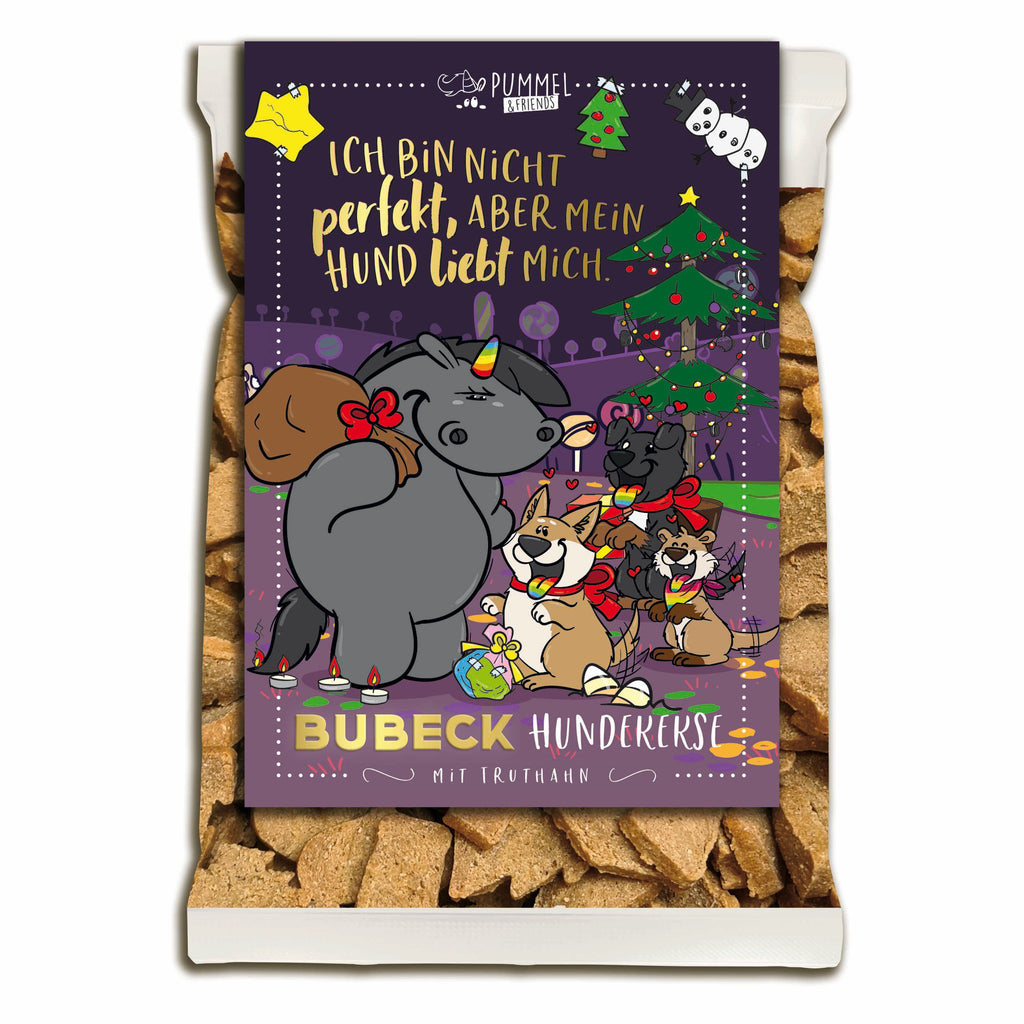 Weihnachtliche köstliche Hundekekse (210 g) mit TRUTHAHN - schonend im magischen Steinofen gebacken. Ein leicht bekömmlicher Snack für alle "Naschbrettbäuche" und Vierbeiner mit Charakter und einem Herz aus Gold. Die ideale Belohnung auch für futtersensible Hunde.