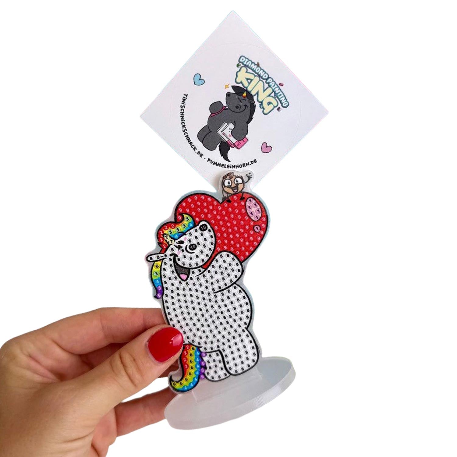 Dieser kleine Fotohalter steckt voller Liebe und Glitzer! Pummeleinhorn hält ein großes Herz fest in den Armen und wartet darauf, von dir mit funkelnden Diamond-Painting-Steinchen verschönert zu werden. Der ca. 10 cm große Halter hat auf der Rückseite eine praktische Klammer – perfekt für Fotos, Erinnerungsstücke oder liebe kleine Botschaften.