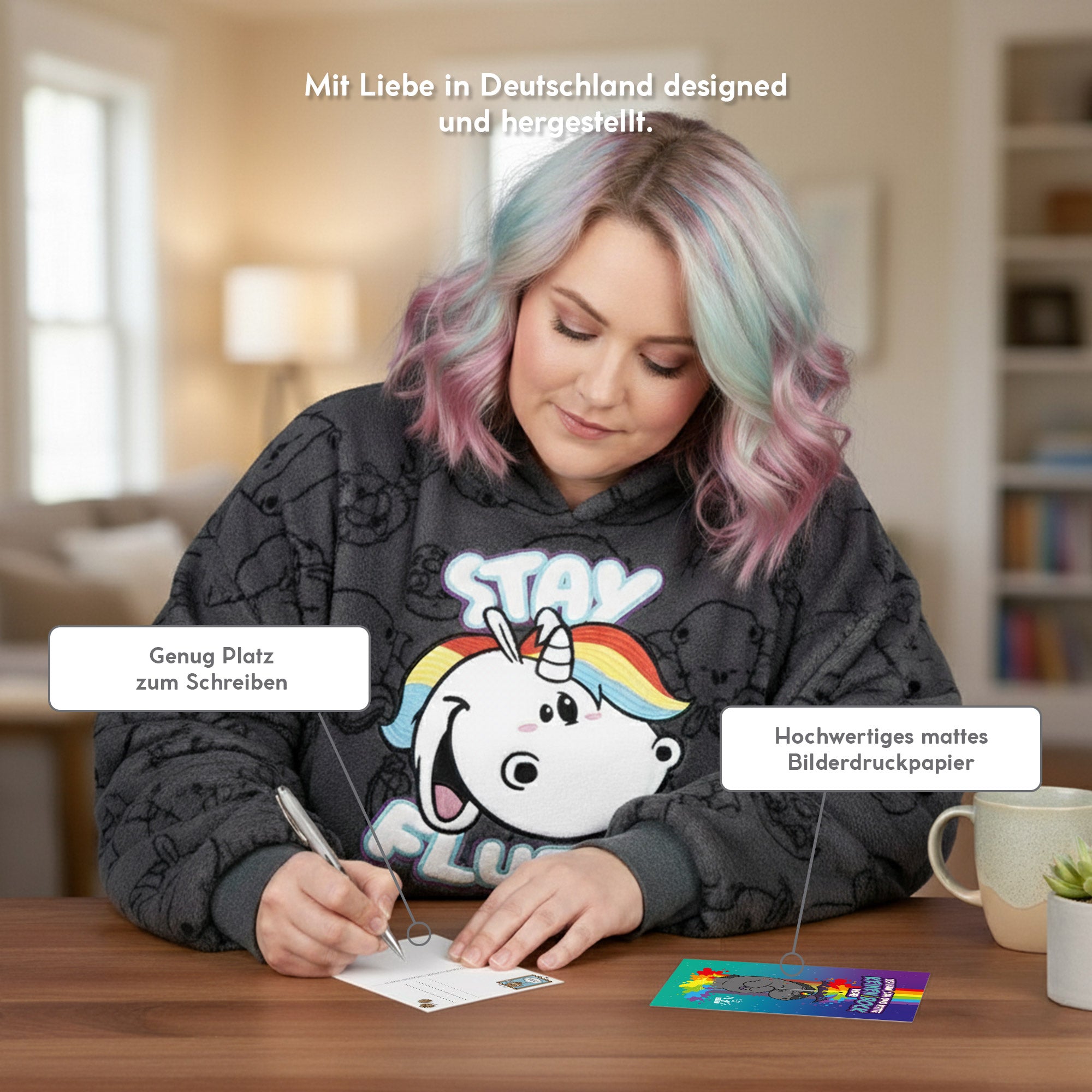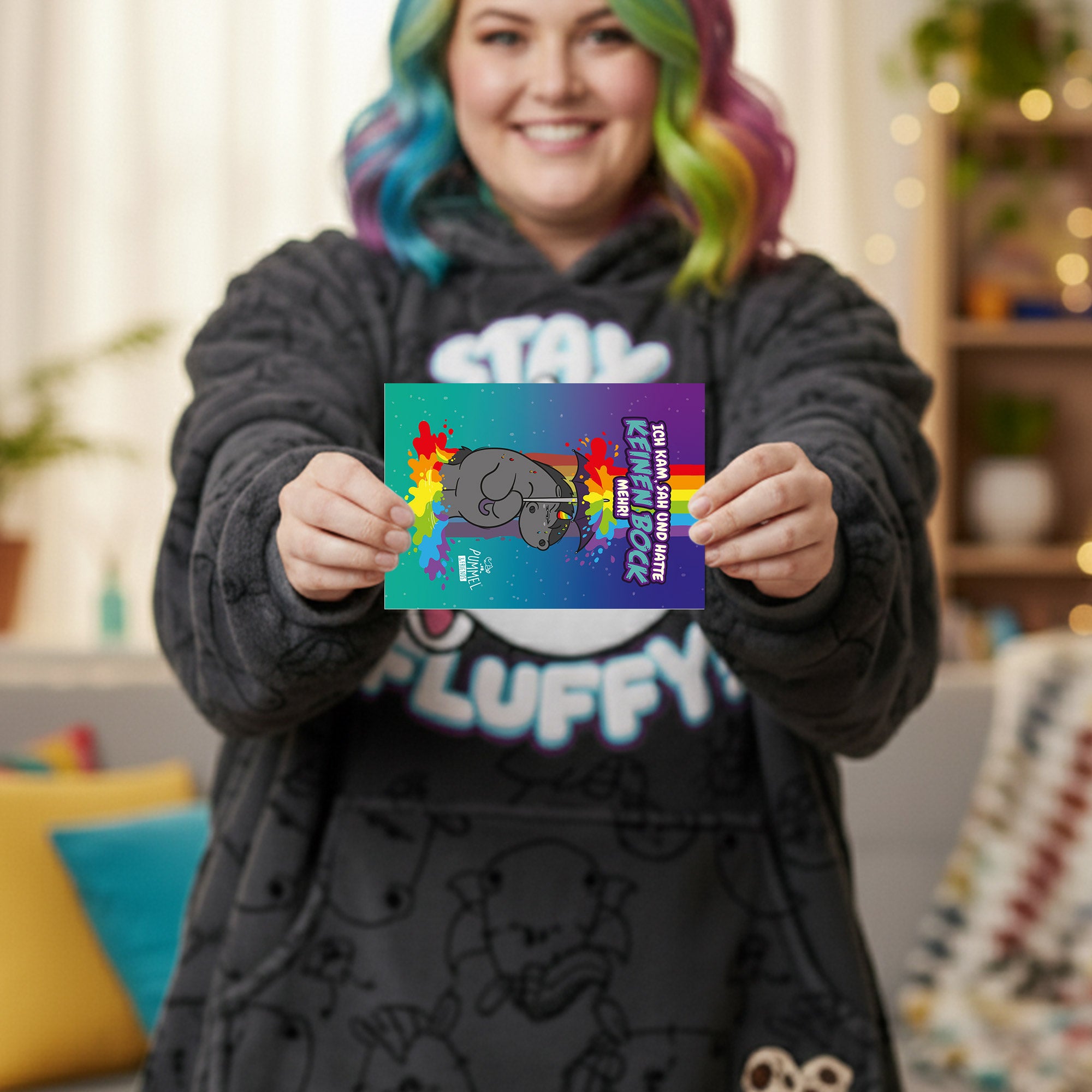 Die Rückseite bietet viel Platz zum Beschreiben und für persönliche Nachrichten. Ideal als kleine Aufmerksamkeit für Freundinnen, Kolleginnen oder für dich selbst, wenn Worte mal direkt und ehrlich sein dürfen. Diese Einhorn Postkarte ist perfekt für humorvolle Grüße, ironische Kommentare zum Alltag oder als augenzwinkerndes Mitbringsel. Eine Geschenkidee für alle, die Sarkasmus lieben und trotzdem Herz zeigen möchten - eben glitzerweltlerisch grummelig.