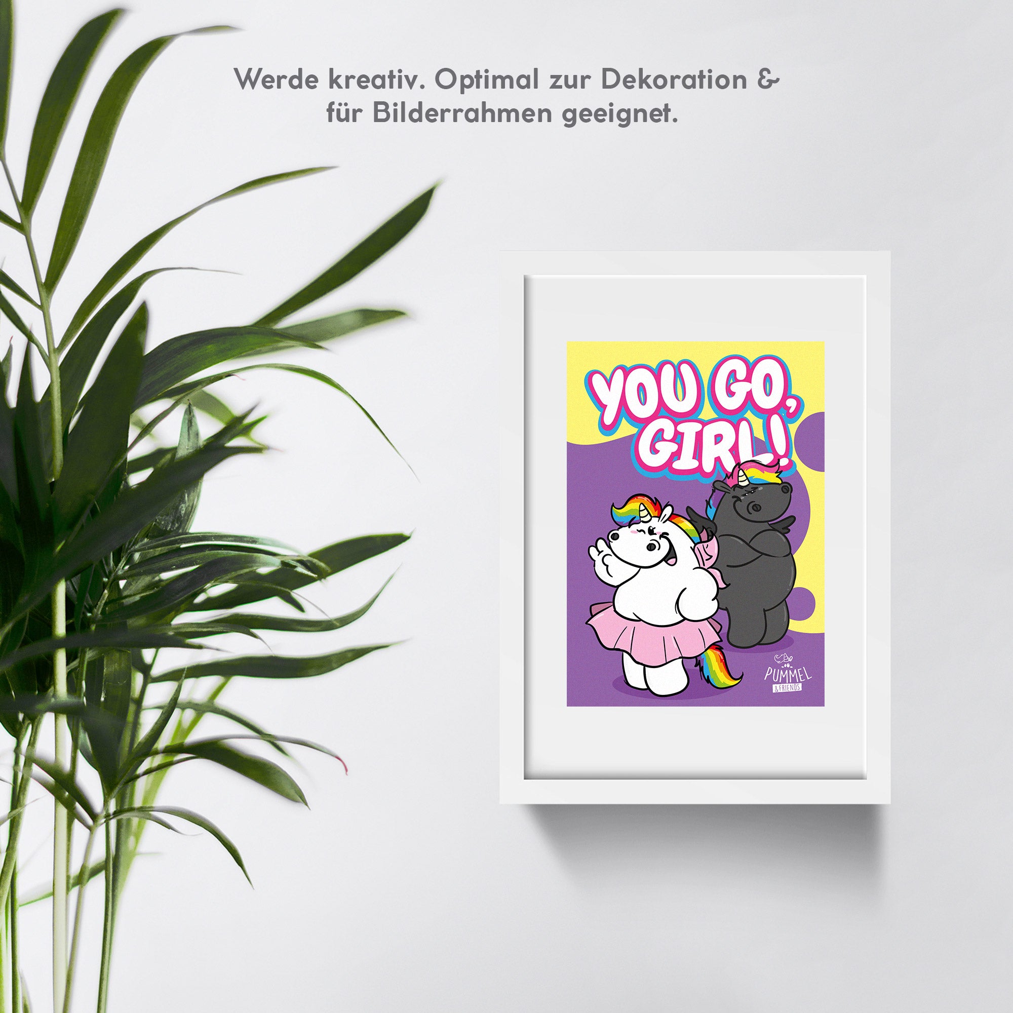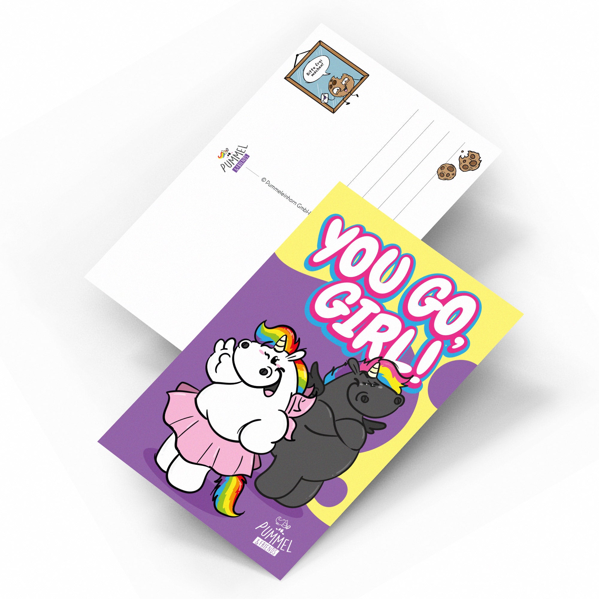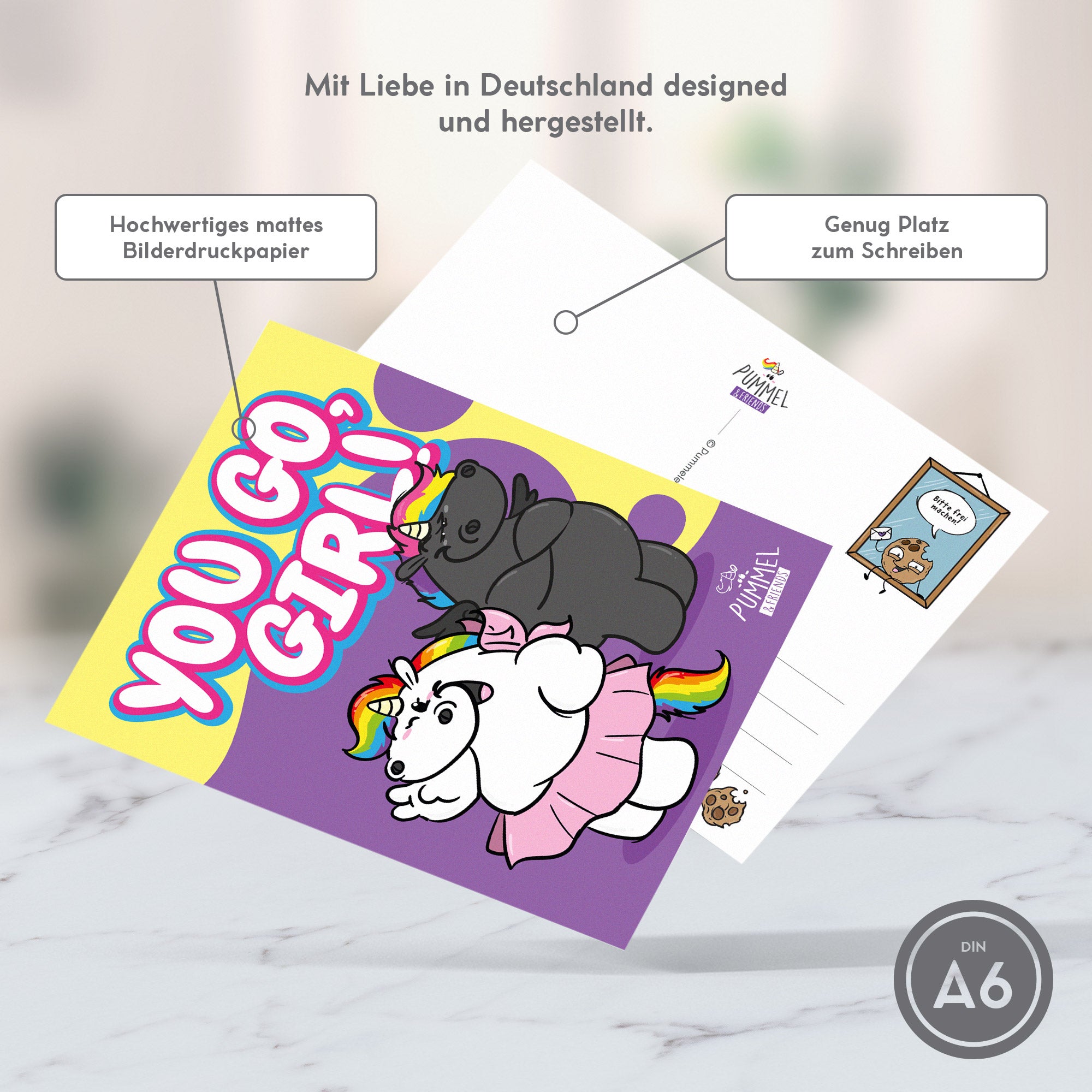 Diese Postkarte im A6 Format steht für Motivation und Zusammenhalt. Runa und Pummelfee strahlen und feiern mit dem Spruch „You go, Girl!“ Mut, Stärke und Selbstvertrauen.