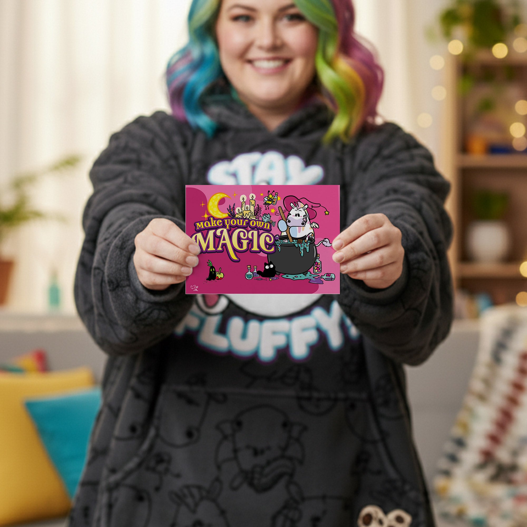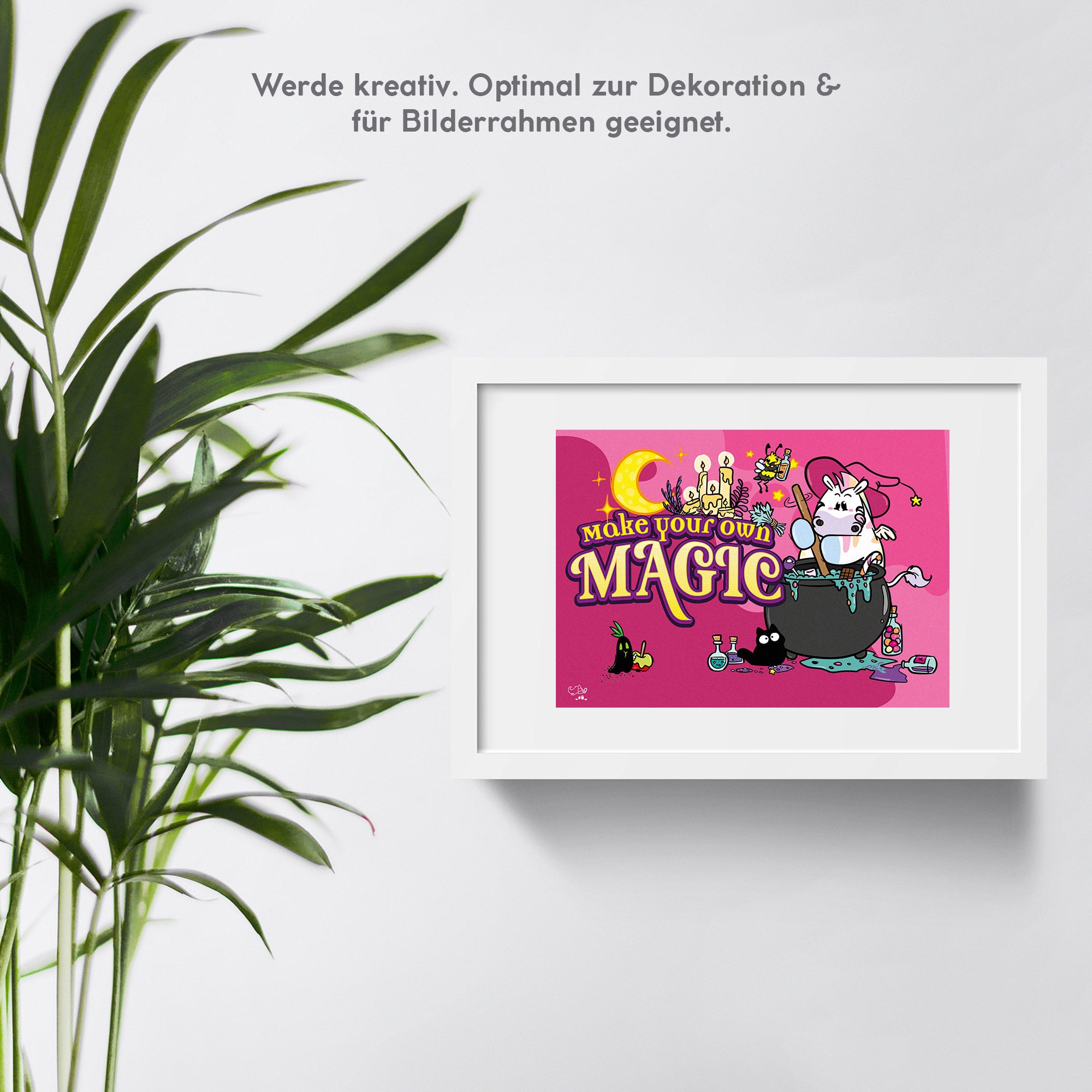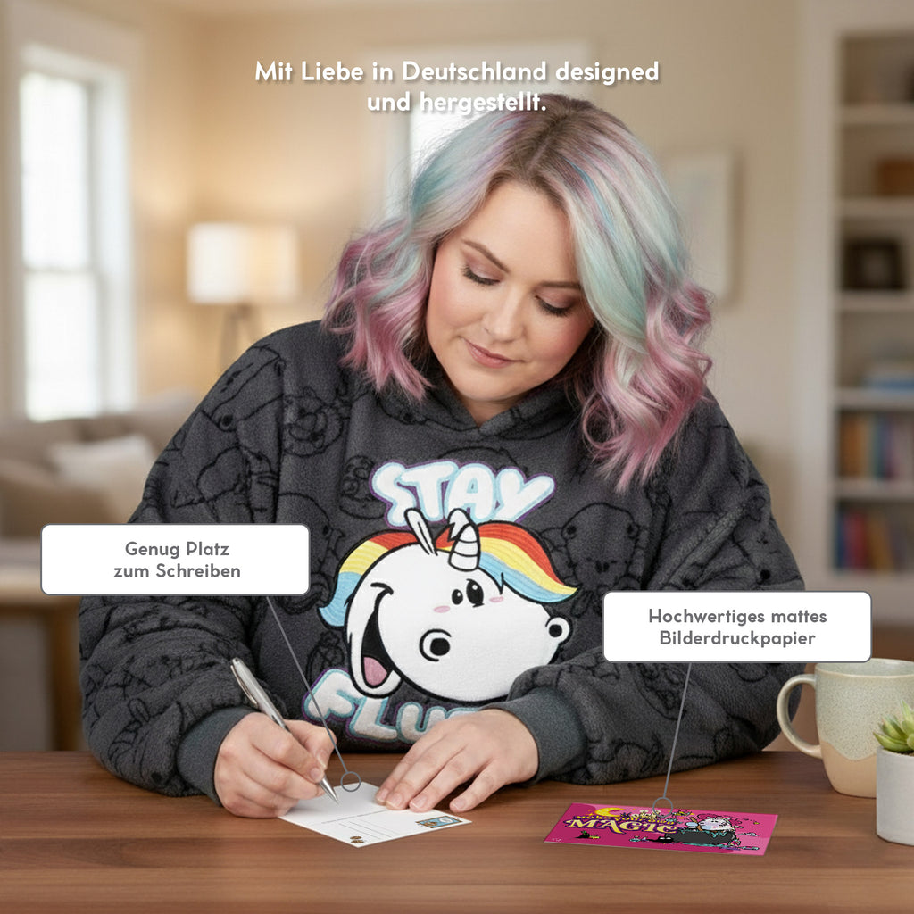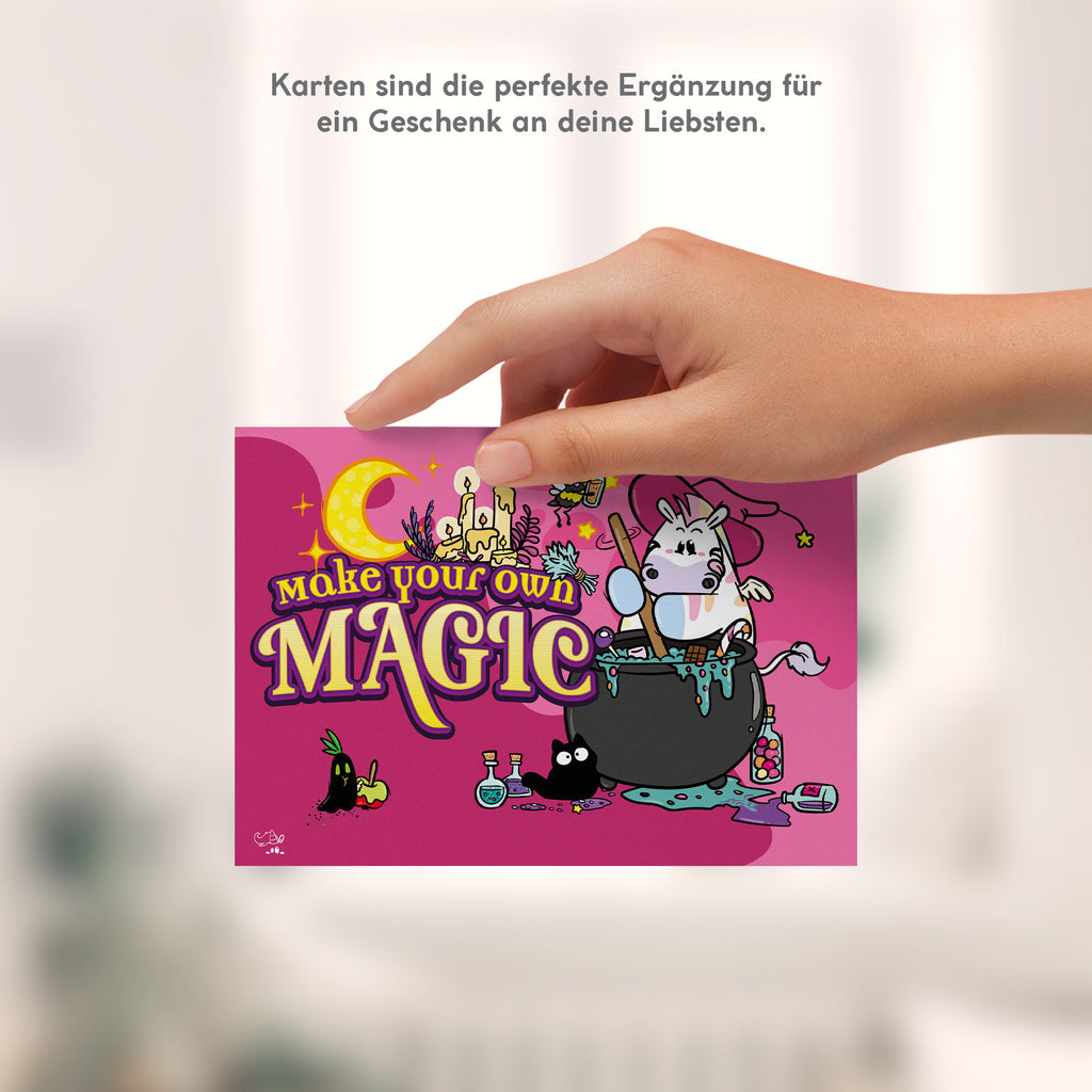 Zebrasus glaubt fest daran: Die Magie steckt in dir! Diese wunderschöne A6 Postkarte mit dem Spruch „Make your own Magic“ erinnert dich oder deine Lieblingsmenschen daran, an die eigene Kraft zu glauben – mit einem Augenzwinkern aus der Glitzerwelt. Ideal zum Verschenken, Inspirieren oder einfach zum Behalten.