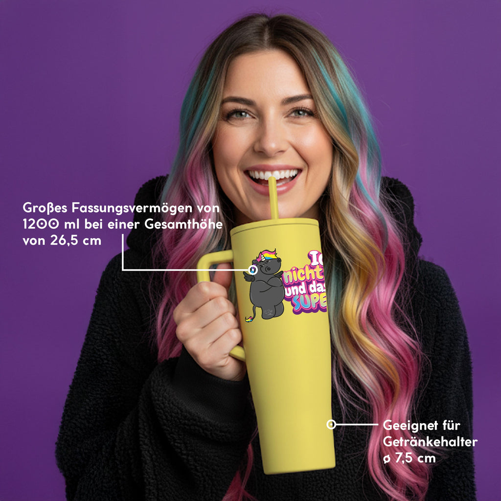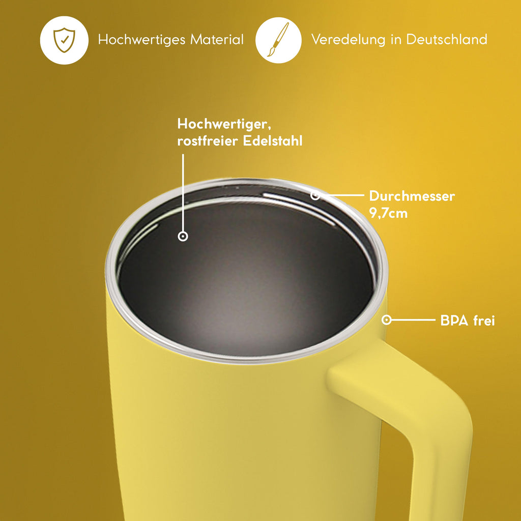 Der Becher fasst 1200 ml, besteht aus rostfreiem Edelstahl und ist BPA-frei. Sein tropfsicherer Verschluss (nicht auslaufsicher) schützt dich unterwegs, und dank seines Becherfußes von 7,6 cm passt er in die meisten Getränkehalter.