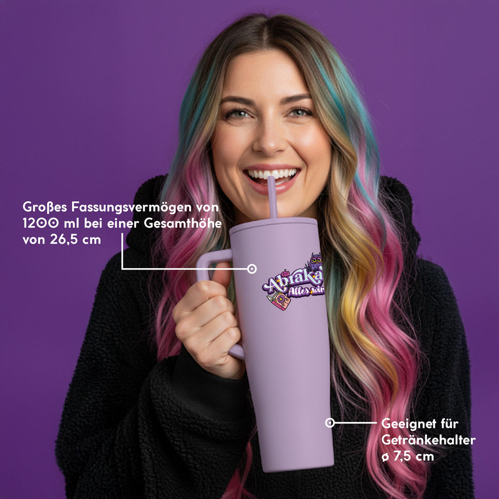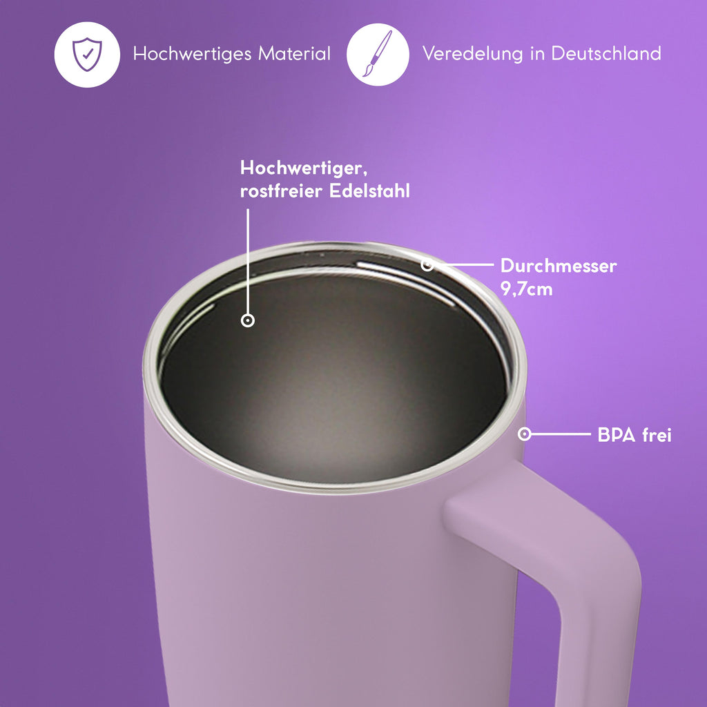 Der To Go Becher fasst 1200 ml deines Lieblingsgetränks, besteht aus rostfreiem Edelstahl und ist natürlich BPA-frei. Der tropfsichere Verschluss (nicht auslaufsicher!) schützt dich unterwegs vor Kleckereien, und dank des Fuß-Durchmessers von 7,6 cm passt der Becher in die meisten Getränkehalter. Magie to go!