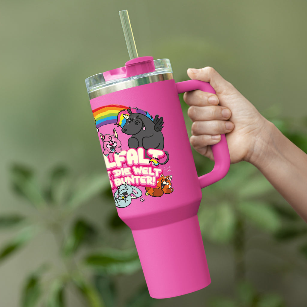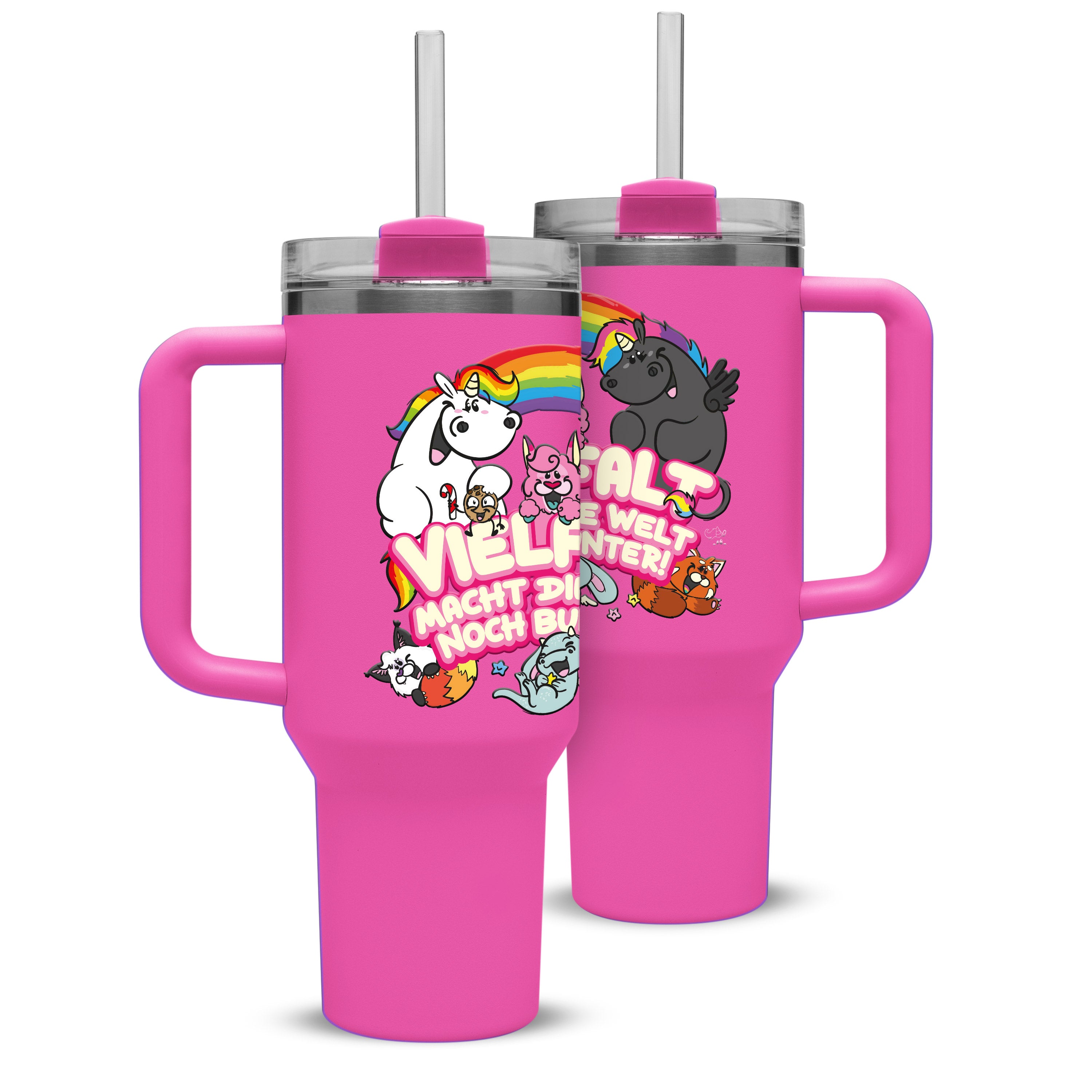 Mit diesem XXL To Go Becher wird jeder Schluck zu einem kleinen Moment voller Freude. Das bezaubernde Pummeleinhorn und die inspirierende Botschaft „Vielfalt macht die Welt noch bunter!“ erinnern daran, wie schön es ist, die Welt in all ihren Farben zu genießen.