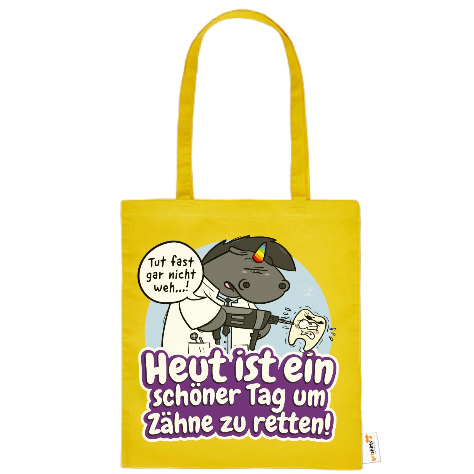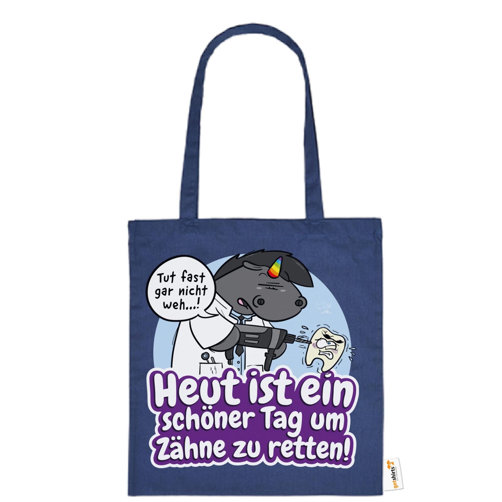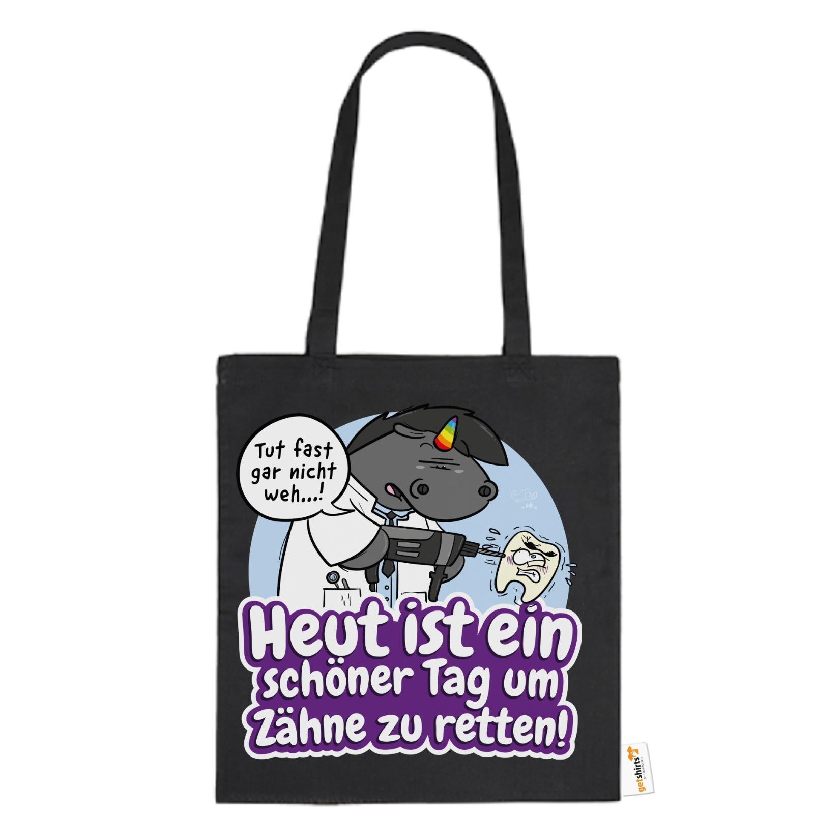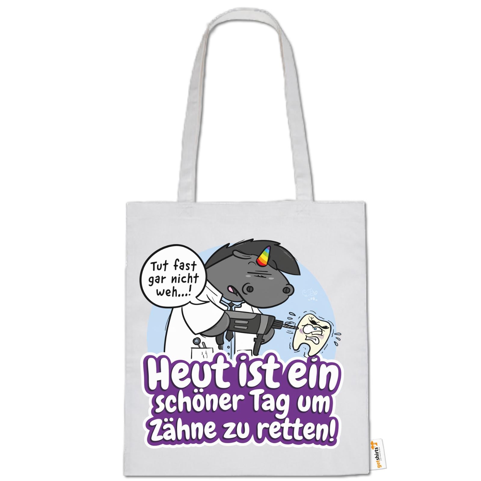 Grummeleinhorn hat den Bohrer in der Hand – und das Herz am rechten Fleck. Mit seinem typischen Charme erinnert diese Baumwolltasche alle Zahnärzte daran, dass jeder Tag ein guter ist, um Zähne zu retten.