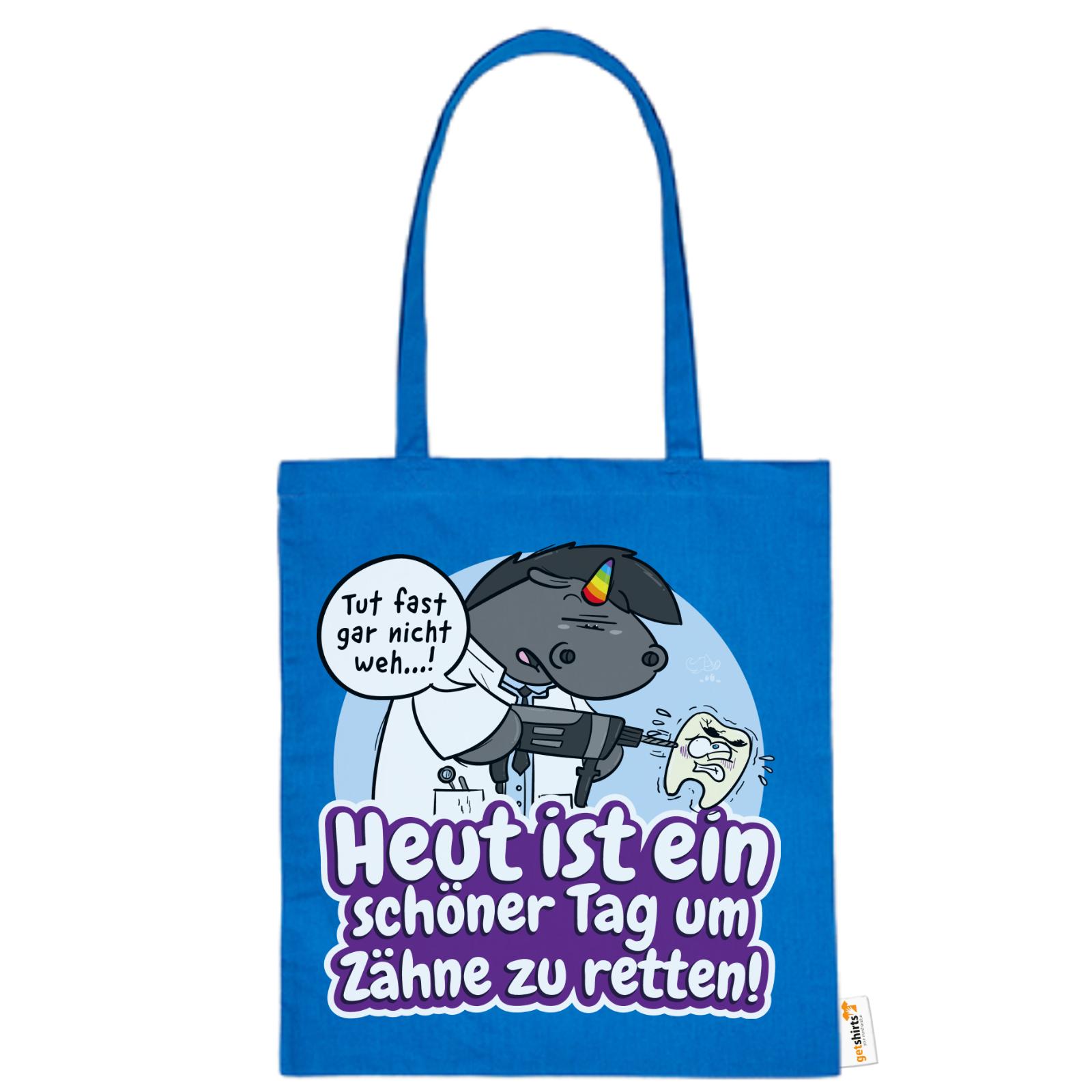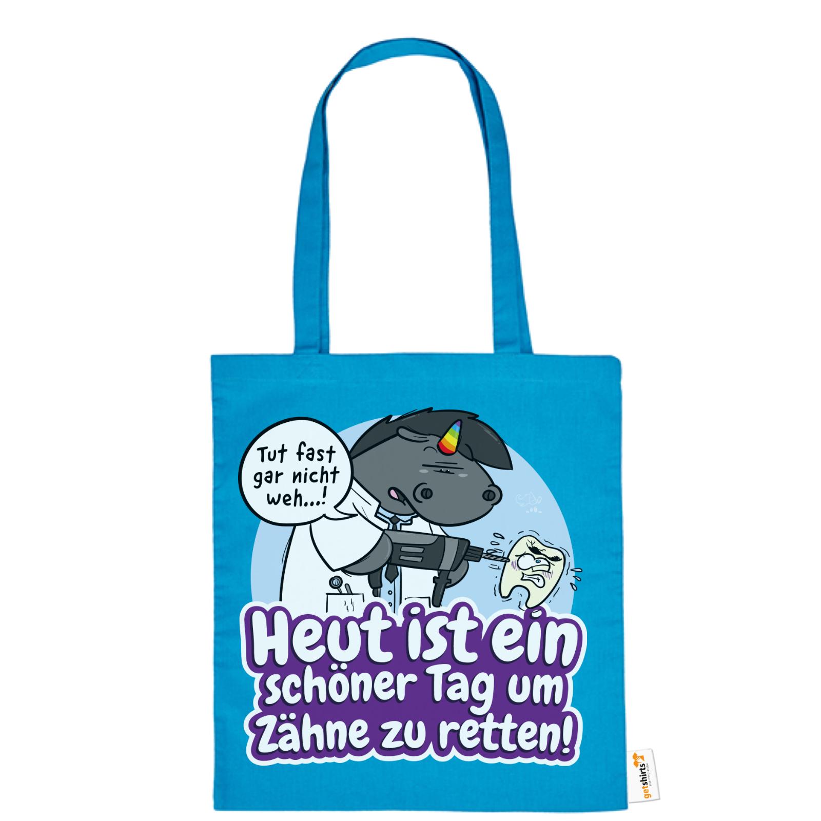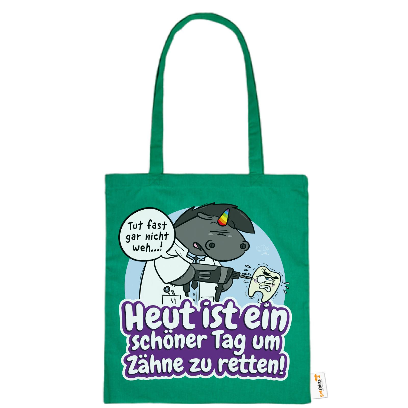 Grummeleinhorn hat den Bohrer in der Hand – und das Herz am rechten Fleck. Mit seinem typischen Charme erinnert diese Baumwolltasche alle Zahnärzte daran, dass jeder Tag ein guter ist, um Zähne zu retten.