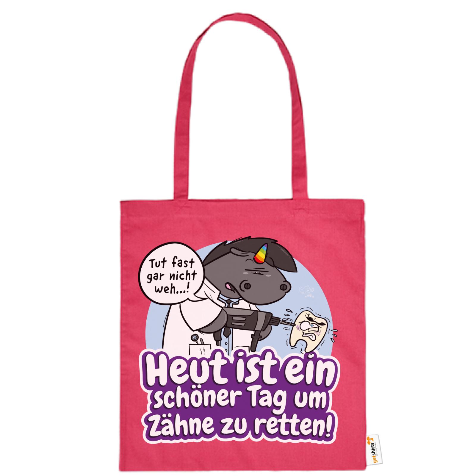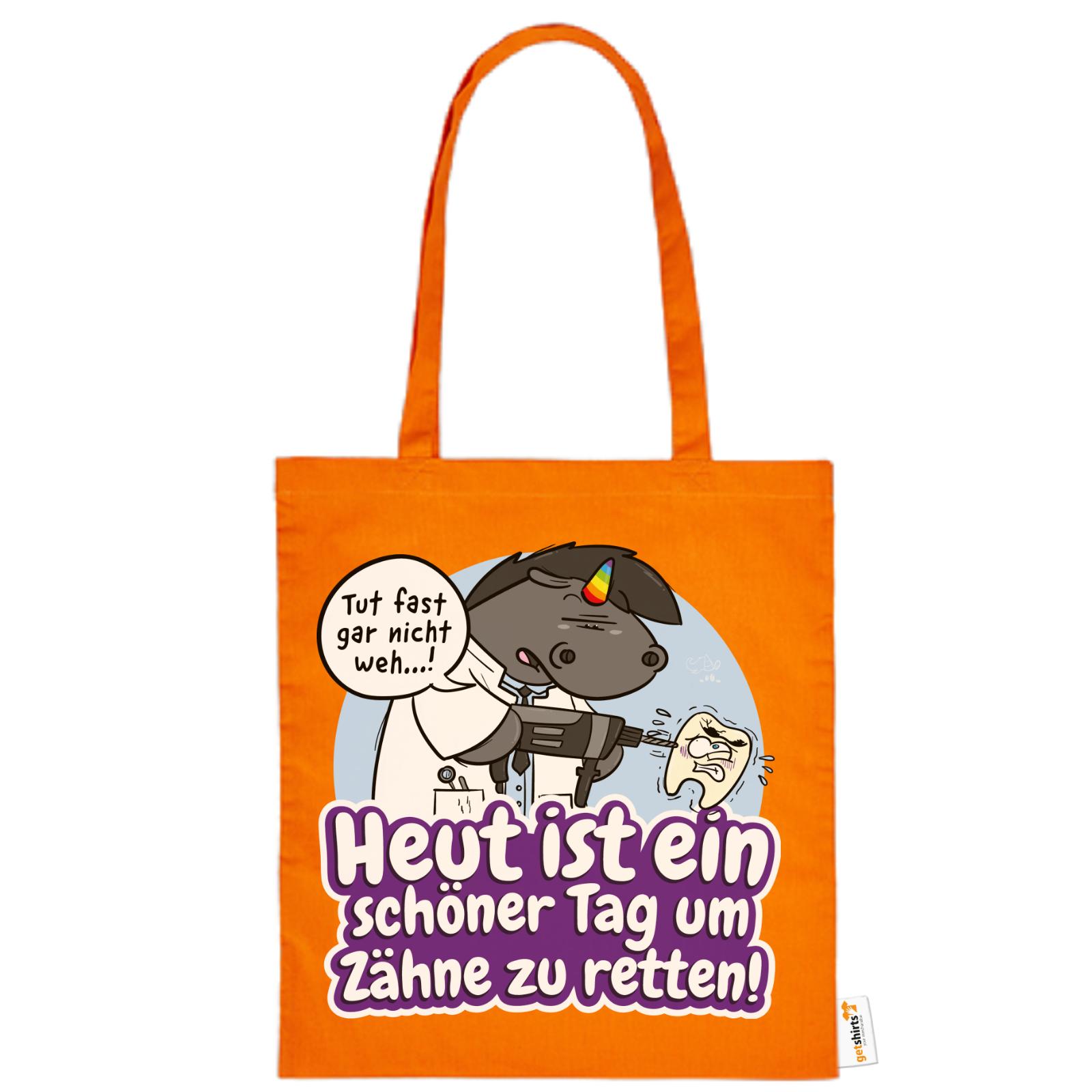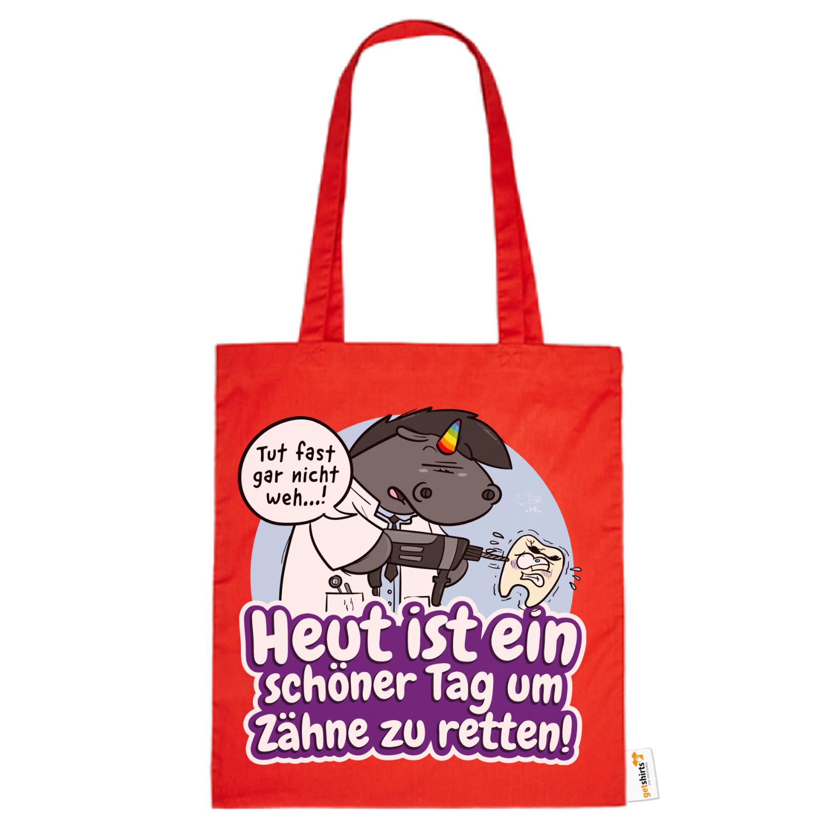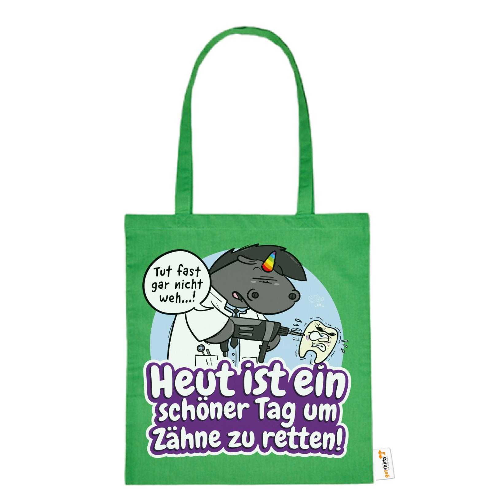 Grummeleinhorn hat den Bohrer in der Hand – und das Herz am rechten Fleck. Mit seinem typischen Charme erinnert diese Baumwolltasche alle Zahnärzte daran, dass jeder Tag ein guter ist, um Zähne zu retten.