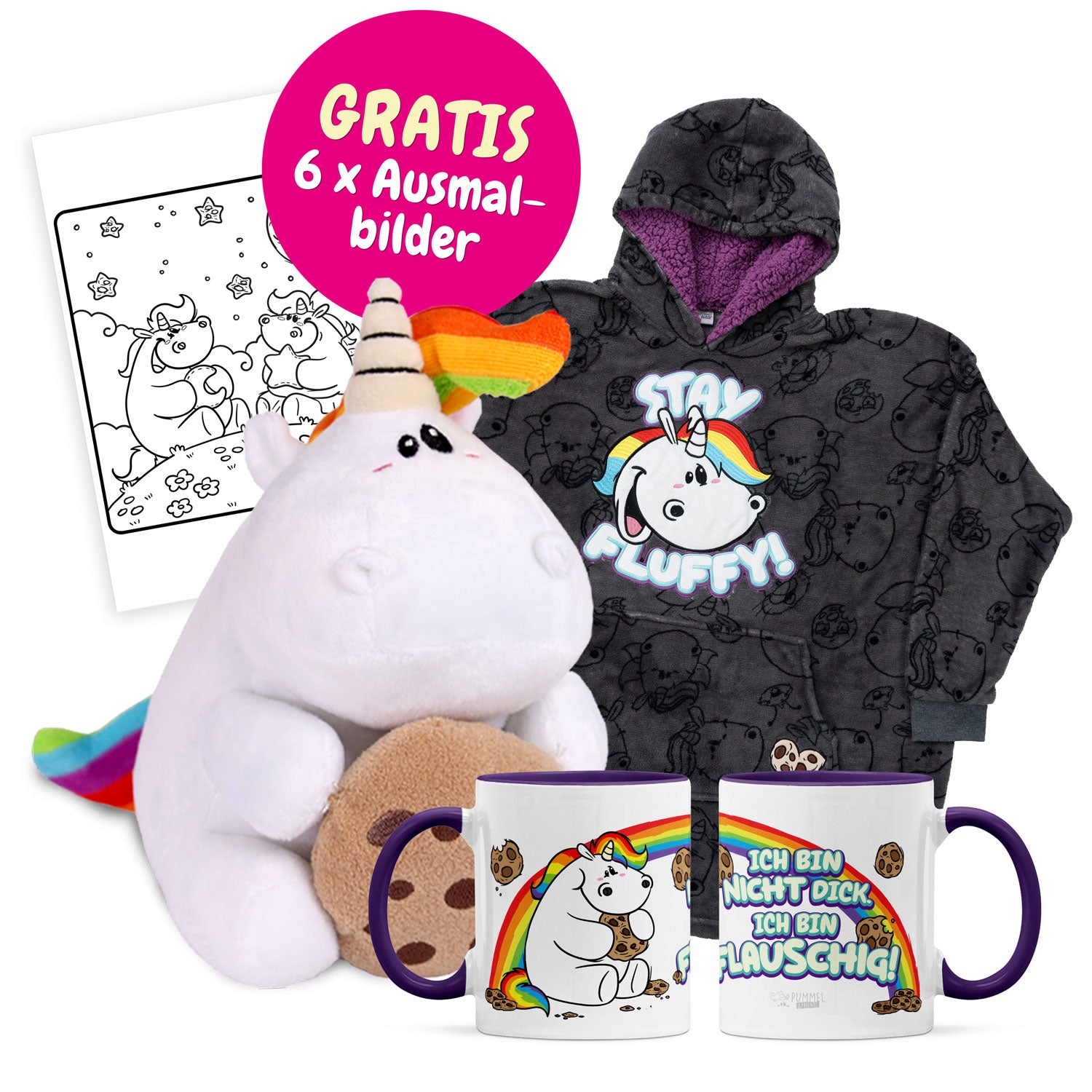 Manchmal reicht ein kuscheliger Hoodie, eine Tasse Tee und ein bisschen Flausch, um die Welt für einen Moment stillstehen zu lassen. Das Me-Time Geschenkset ist genau für diese kleinen, heilsamen Pausen gemacht. Es schenkt dir das Gefühl, angekommen zu sein – bei dir selbst. Der gemütliche Cozy Oversized Hoodie (passt bis Größe 56/58) fühlt sich an wie eine liebevolle Umarmung, ohne Kompromisse. Die Tasse mit der Botschaft „Es heißt Gleichgewicht, weil alles gleich wichtig ist“ erinnert dich bei jedem Schluck daran, dass auch deine Bedürfnisse zählen. Und das flauschige Pummeleinhorn-Kuscheltier ist der perfekte Begleiter für ruhige Abende oder kleine Auszeiten im Alltag.